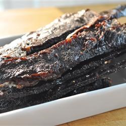 4. Arrange the beef strips on the rack of a dehydrator, and sprinkle with a little bit more of the spice mixture and red pepper flakes if using. Dry for 5 hours, or to your desired dryness.