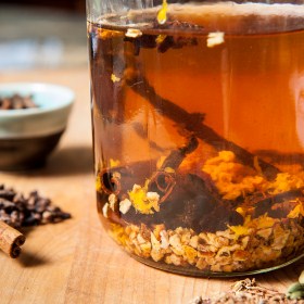 Bruise the spices and macerate in the alcohol for 10 days. Strain and filter before bottling.