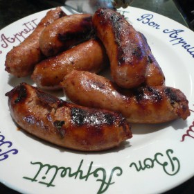 Combine all ingredients, mix well, and stuff into sheep casings. Fry in butter or oil.