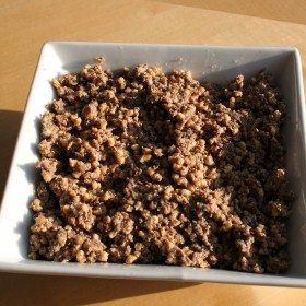 Boil the liver and parboil the onion, then mince them together. Lightly brown the oatmeal then mix all