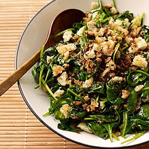 Return cooked spinach to skillet; add salt and toss over low heat. Transfer to a serving bowl and sprinkle with crumbs. Or toss with half of crumbs and sprinkle remaining crumbs over each serving. Yields about 3/4 cup spinach and 2 tablespoons crumbs per serving.