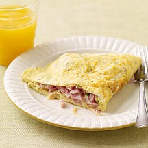 Sprinkle ham and cheese over eggs. Using a spatula, ease up edges of omelet and gently fold in half; cook until heated through, about 1 minute. Yields 1/2 of omelet per serving.