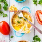 4. Evenly and lightly sprinkle the diced tomatoes between the two ramekins; set aside.