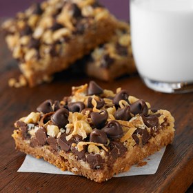 3. Sprinkle cracker crumbs evenly on top of butter followed by a layer of chopped nuts, a layer or chocolate pieces and a layer of coconut.