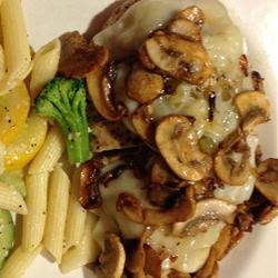 6. Remove chicken from the oven, top with mushrooms and their pan juices, and serve.