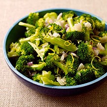 Add broccoli, lemon peel, thyme, salt and pepper; toss over low heat until broccoli is coated and hot, about 2 to 3 minutes. Transfer to serving bowl. Yields about 1 1/4 cups per serving.