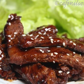 3. Place 1 tablespoon rice and 1 slice of beef on each lettuce leaf. Add a drop of bean paste, if you desire. Wrap like a taco, and serve immediately.