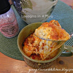 Spray 1 soup mug or small bowl with non-stick cooking spray. Add 1 Tbsp. pizza sauce and spread on the bottom of your mug. In small bowl, combine ricotta cheese, Parmesan cheese, garlic powder, onion powder, Italian seasoning, and salt. Mix together well. Pour into soup mug on top of pizza sauce. Add 1 Tbsp. mozzarella cheese on top. In small bowl, mix chopped turkey sausage with 2 Tbsp. pizza sauce and spread on top of cheese mixture. Sprinkle 2 Tbsp. mozzarella on top. Cover and microwave 2 to 2 ½ minutes on high. Let cool for a couple minutes.