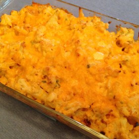 Preheat oven to 375. Bring a large pot of water to a boil. Season the water with salt. Spray the baking dish with olive oil spray. Cook cauliflower in boiling water until crisp, yet tender, about 5 minutes. Drain well and pat between several layers of paper towel to dry. Transfer the cauliflower to the baking dish and set aside.
