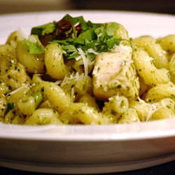 3. Toss the cooked farfalle, pesto, Parmesan cheese, and cilantro into the skillet, and continue cooking just until heated through.