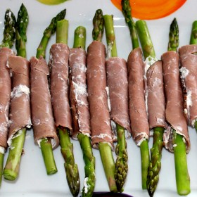 Boil water and lightly cook asparagus for 2-3 minutes. You want them to be crispy! Mix together cream cheese and horseradish. Add horseradish to your own taste, usually 3-5 tablespoons. Spread each slice of roast beef with a thin layer of mixture. Roll up the asparagus spear inside of the roast beef.