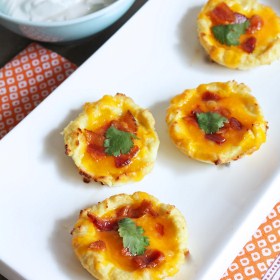 Cook florets in boiling water for about 6 minutes, or until well done. Drain well; do not let cool and pat cooked cauliflower very dry between several layers of paper towels. Using a blender, food processor or immersion blender, puree the hot cauliflower with the cream cheese, parmesan, garlic, chicken bouillon, and pepper until almost smooth. Let mixture cool. Add the egg to your cauii-puree and mix well. Place about 2 Tbsp. of mash into each greased muffin tin cup. Spread out the puree to about a half-inch thickness on the top and sides. Too thin and it won't come out of the tin. Bake the cauli-cups at 375 degrees for 30 minutes until firm. Take them out using a butter knife, release them gently from the muffin tin and place on a greased cookie sheet Fill with reduced-fat cheese and turkey bacon and put back in the oven for 5 minutes or until melted. Garnish with scallions.
