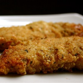 Press chicken into parmesan cheese.