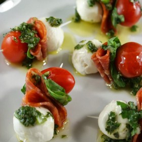 Thread the mozzarella ball onto the toothpick, then fold the pepperoni in quarters and thread onto the toothpick. Next, add the basil leaf then the tomato.