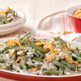 Put the trimmed and rinsed green beans into an empty 6-quart slow cooker insert and pour the mushroom mixture evenly over the top. Stir to disperse the ingredients. Cover and cook on low for 5 hours, or on high for about 2 hours. Stir again, and serve as-is, or top with a cup of fried onions.