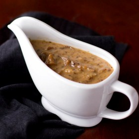 Combine the mushrooms with reduced gravy and season with salt and pepper.