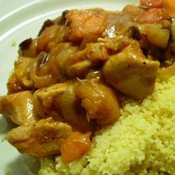 2. Place the browned chicken and eggplant on the bottom of a slow cooker. Layer the onion, carrots, dried cranberries, and apricots over the chicken.