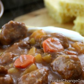 You can use fully cooked store bought meatballs (just thaw them and quarter them before adding).