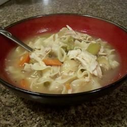 4. When the chicken is done, remove the meat and vegetables to a platter. Transfer the juices to a large pot and stir in 2 quarts of chicken broth. Bring to a boil and add the noodles. Cook for about 10 minutes, until tender. Meanwhile, remove the meat from the chicken and shred. Discard bones and skin. When the noodles are done, return the vegetables to the pot and add shredded chicken meat. Serve.