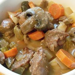 1. Place the carrots, potatoes, mushrooms, onion and celery in the slow cooker. Place the stew meat over the vegetables.