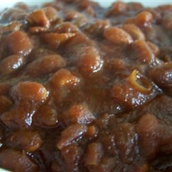 2. Stir ketchup, water, molasses, onion, mustard, salt, bacon, and brown sugar into the beans until well mixed.